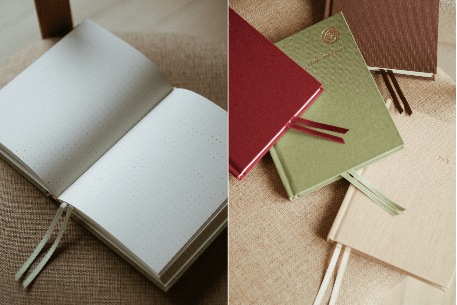- Elegancka, przyjemna w dotyku okładka z płótna z minimalistycznym złotym tłoczeniem i 2 tasiemkami - twarda oprawa chroni cenne strony a szyto-klejone wnętrze rozkłada się na płasko.