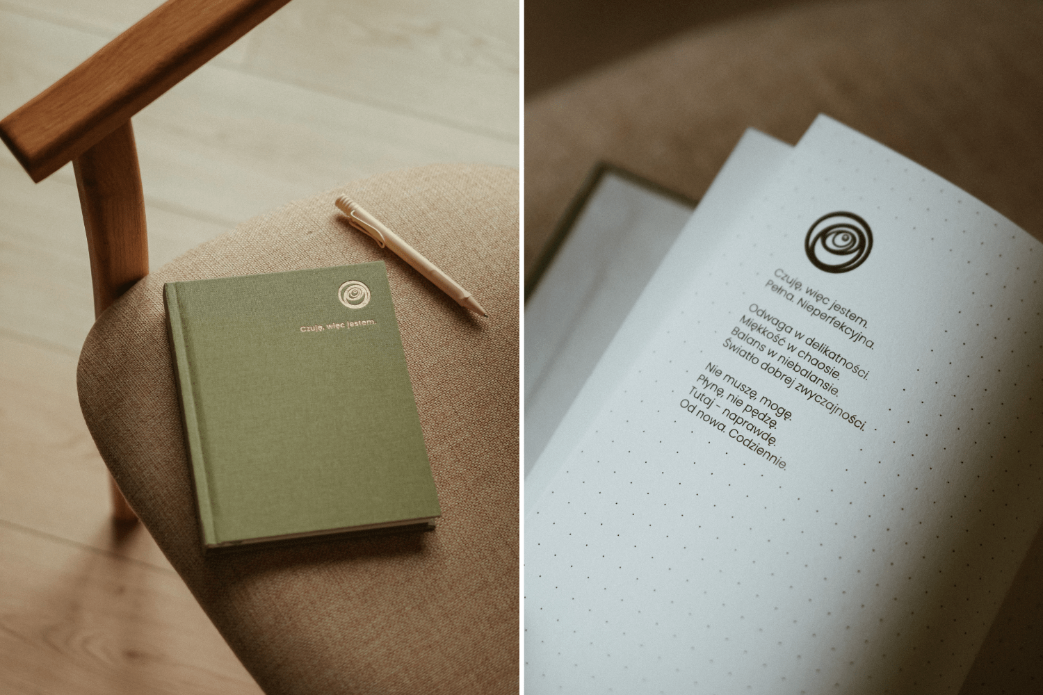 Tytuł „Czuję, więc jestem” łączy się z sentencją w środku - razem tworzą przypomnienie: czucie jest drogą, bycie jest wystarczające a spokój zaczyna się tam, gdzie pozwalasz sobie... na Siebie.